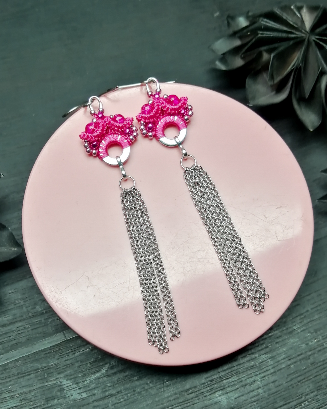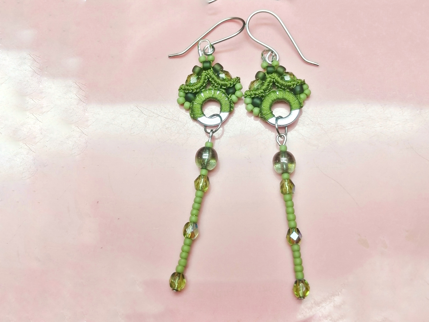 Lovely necklaces and earrings in different colors made with Frivolite technique. Quality glass beads give them that fancy look and extra sparkle. No hardeners were used. Also by custom made orders.