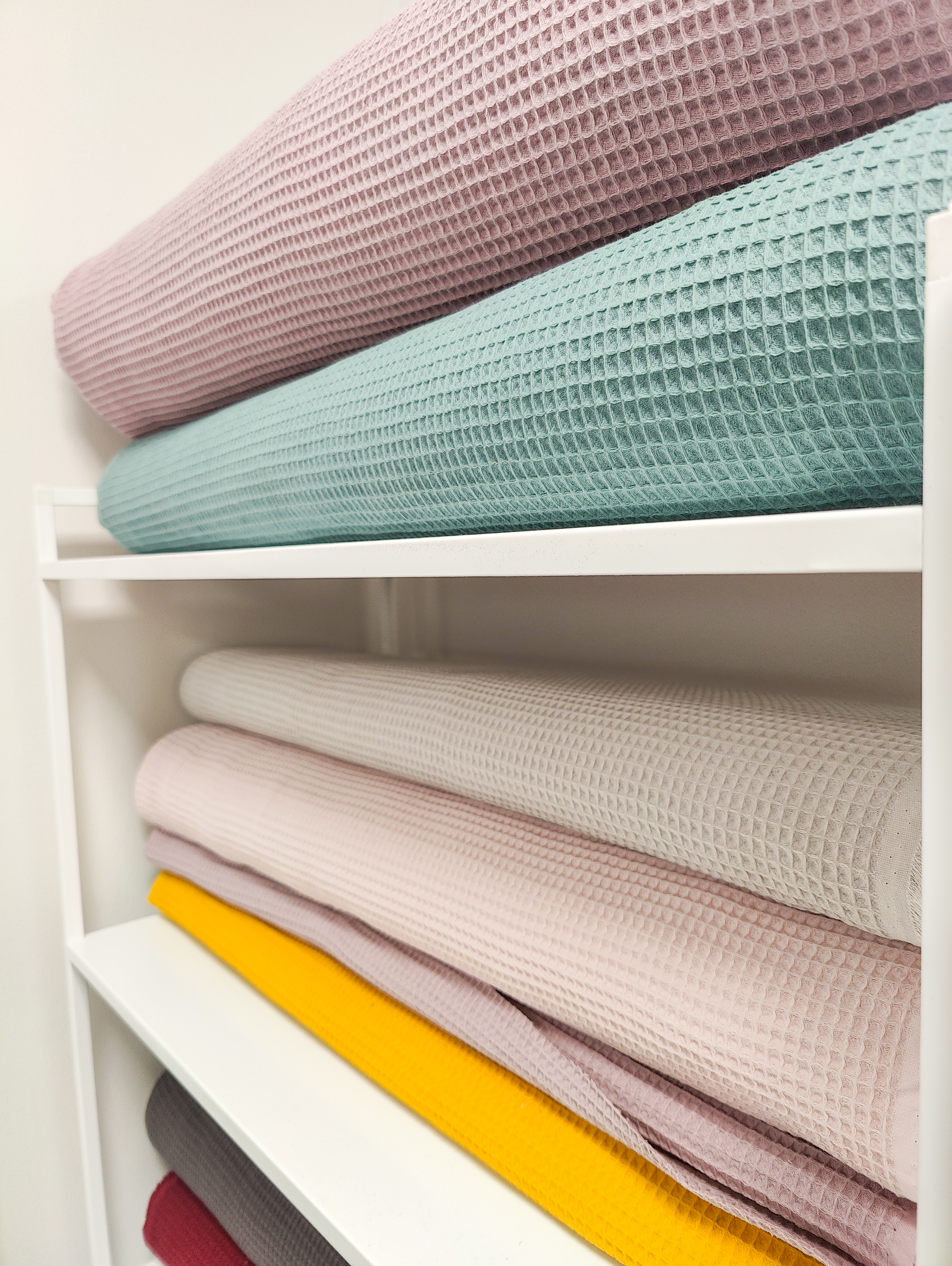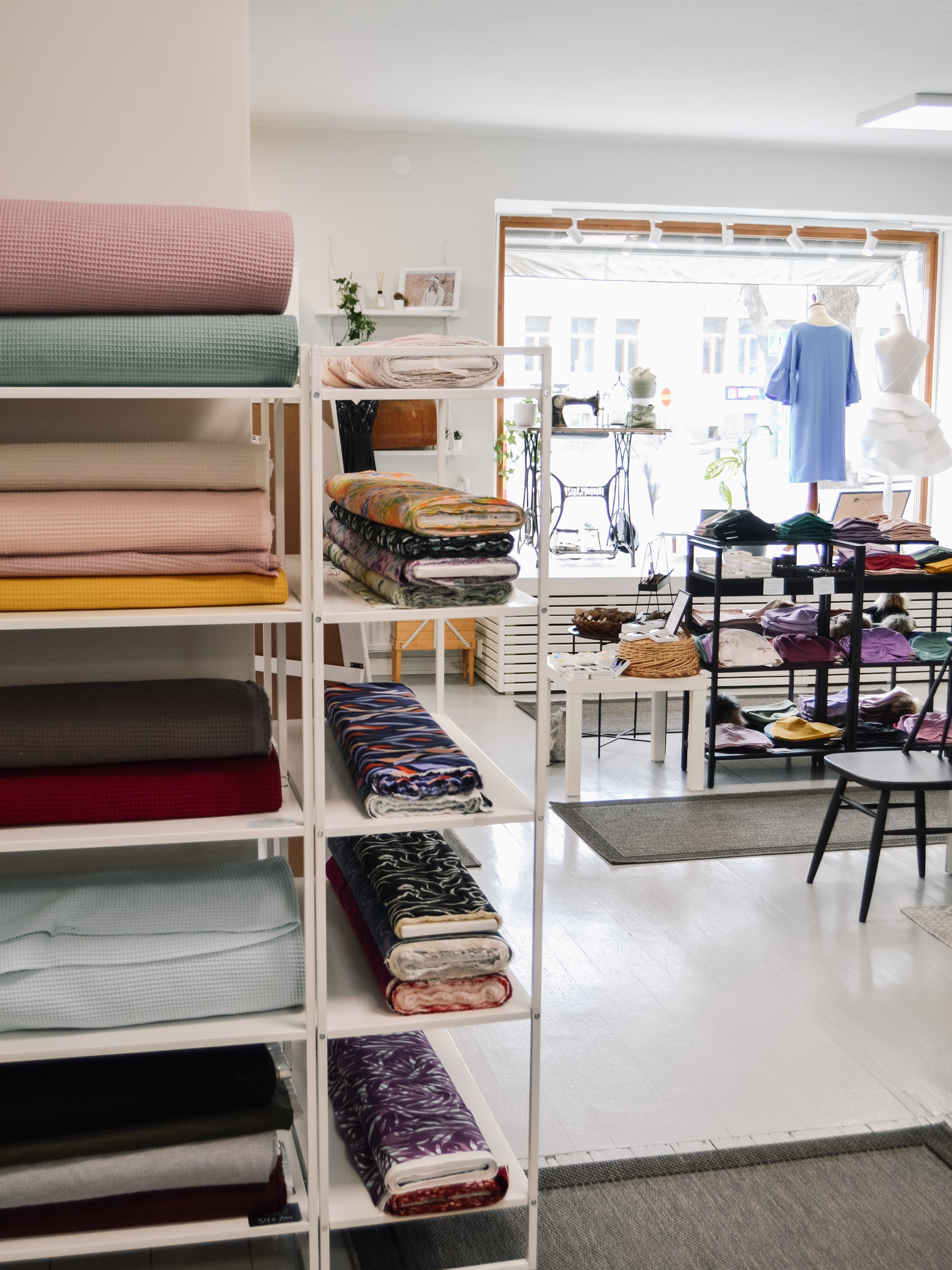 Milja Muhosen putiikista löydät design-tuotteiden lisäksi myös vaatetuskankaita, kuten pellavaa, trikoota ja viskoosia. Putiikissa myös hyvä valikoima ompelutarvikkeita: nauhoja, neuloja, neppareita, ompelulankoja ja paljon muuta!