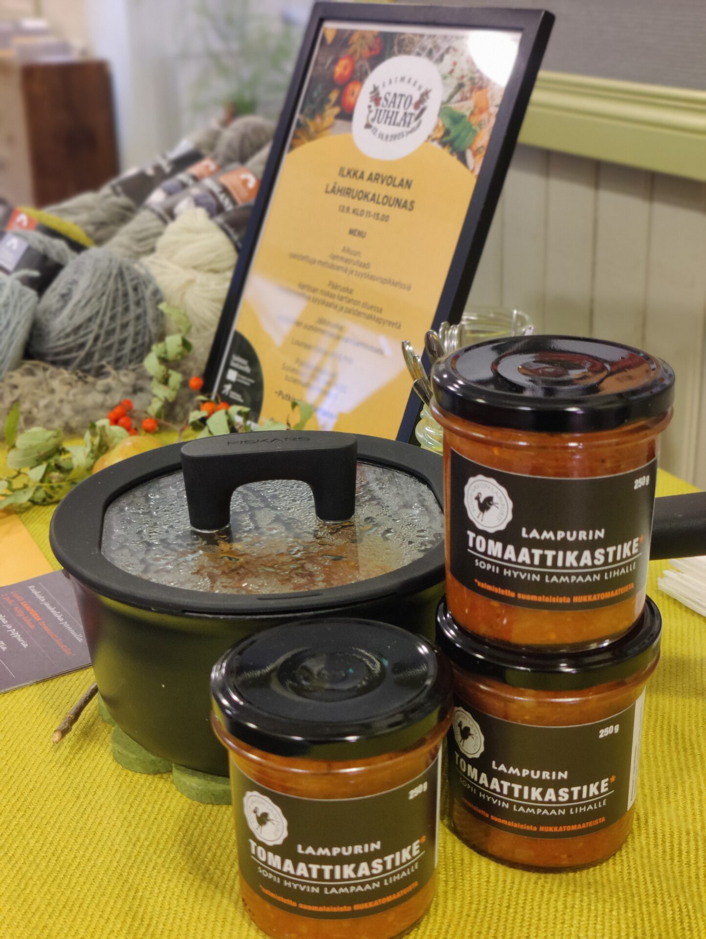 - Putkisalon Kartano ja lammatila – Käsityönä tehdyt D.O. Saimaa -raakamakkarat Chorizo ja Salciccia 100 % karitsanlihasta sekä lampurin tomaattikastike hävisivät tarjoiluvadeilta alta aikayksikön! Tomaattikastike oli valmistettu hävikkitomaateista ja pöydällä somisteena olleet villalangat oli värjätty – lupiineilla!
