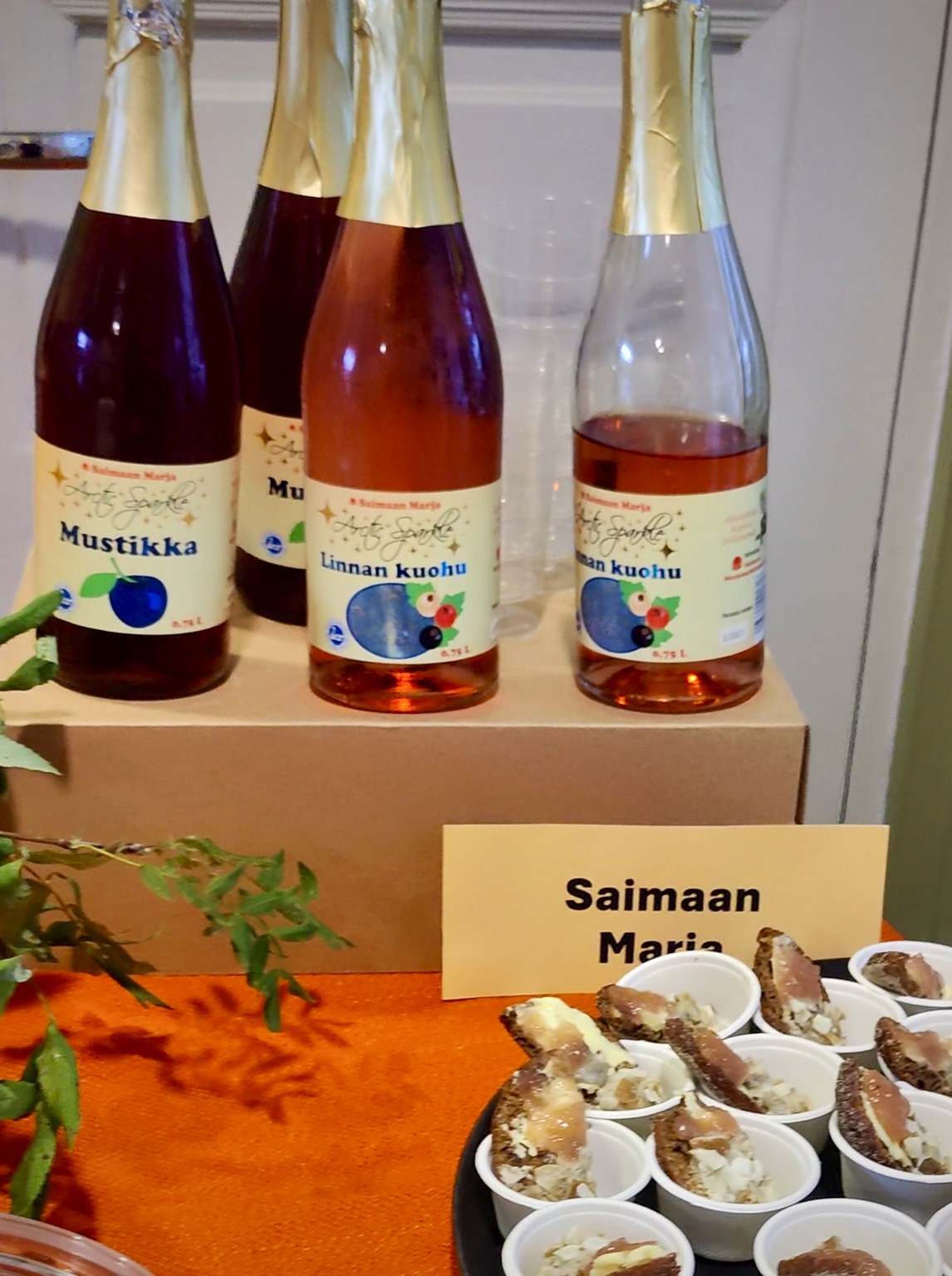 - Saimaan Marja – Herukoista valmistettu kuohujuoma toi pöytään pirteää kirpeyttä, mustikkajuoma puolestaan pehmeää makeutta. Ruislastulla metsäsienisalaatti ja omenahillo yhdistivät metsän ja puutarhan maut yhdeksi suupalaksi.